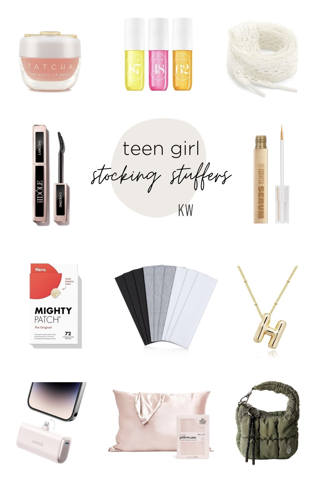 lip mask + perfume set + lace shoelaces + mascara + eyelash serum + pimple patches + headbands + necklace + portable charger + silk pillowcase + quilted pouch