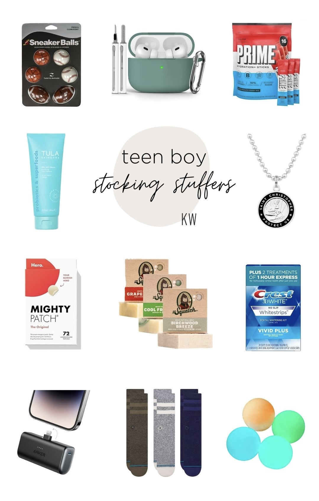 sneaker balls + airpod case + prime drink + face wash + necklace + pimple patches + soap + whitening strips + portable charger + socks + glow balls
