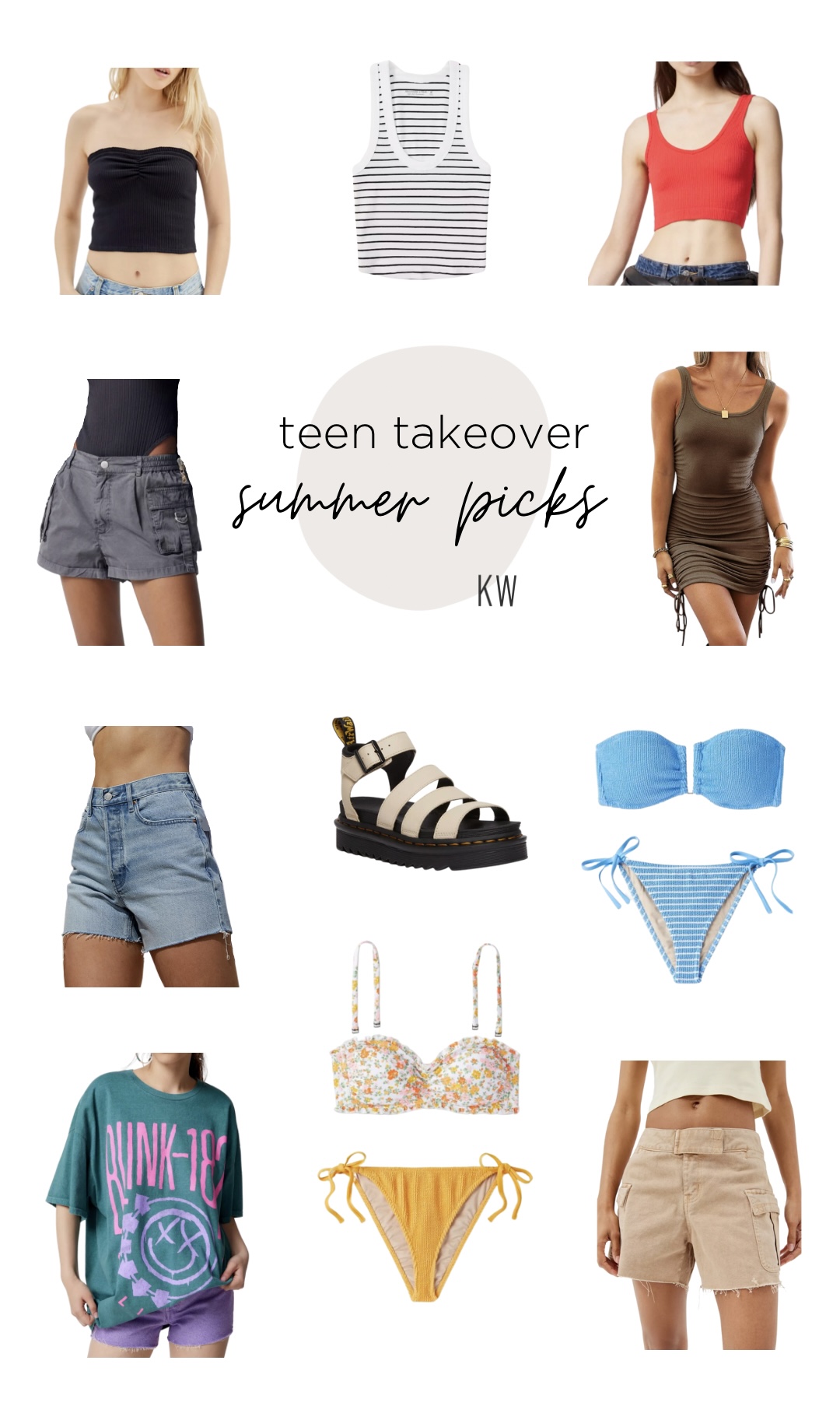 tube top + striped tank + red tank + dark cargo shorts + brown dress + denim shorts + sandals + blue swim top + blue swim bottoms + graphic tee + floral swim top + yellow swim bottoms + cargo shorts