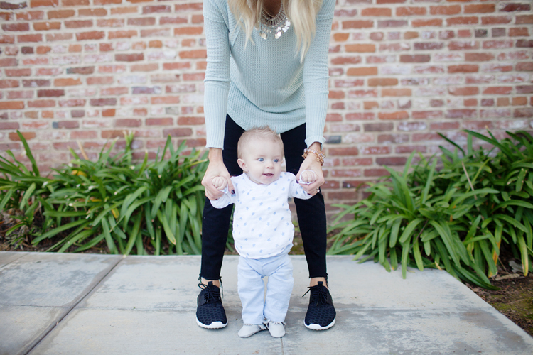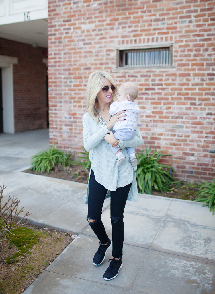 Comfortable outfit : This is key for me with four little people and running around all day long. I need an outfit that is functional but I also want to wear something that is fashionable as well!! This top honestly feels like a pajama top + these black pants are seriously amazing and so worth every penny!! The stretch in them is unreal and I only wash them about every 4-5 wears. Plus, black hides spills or spit up from your little people.. so you can look put together the entire day.