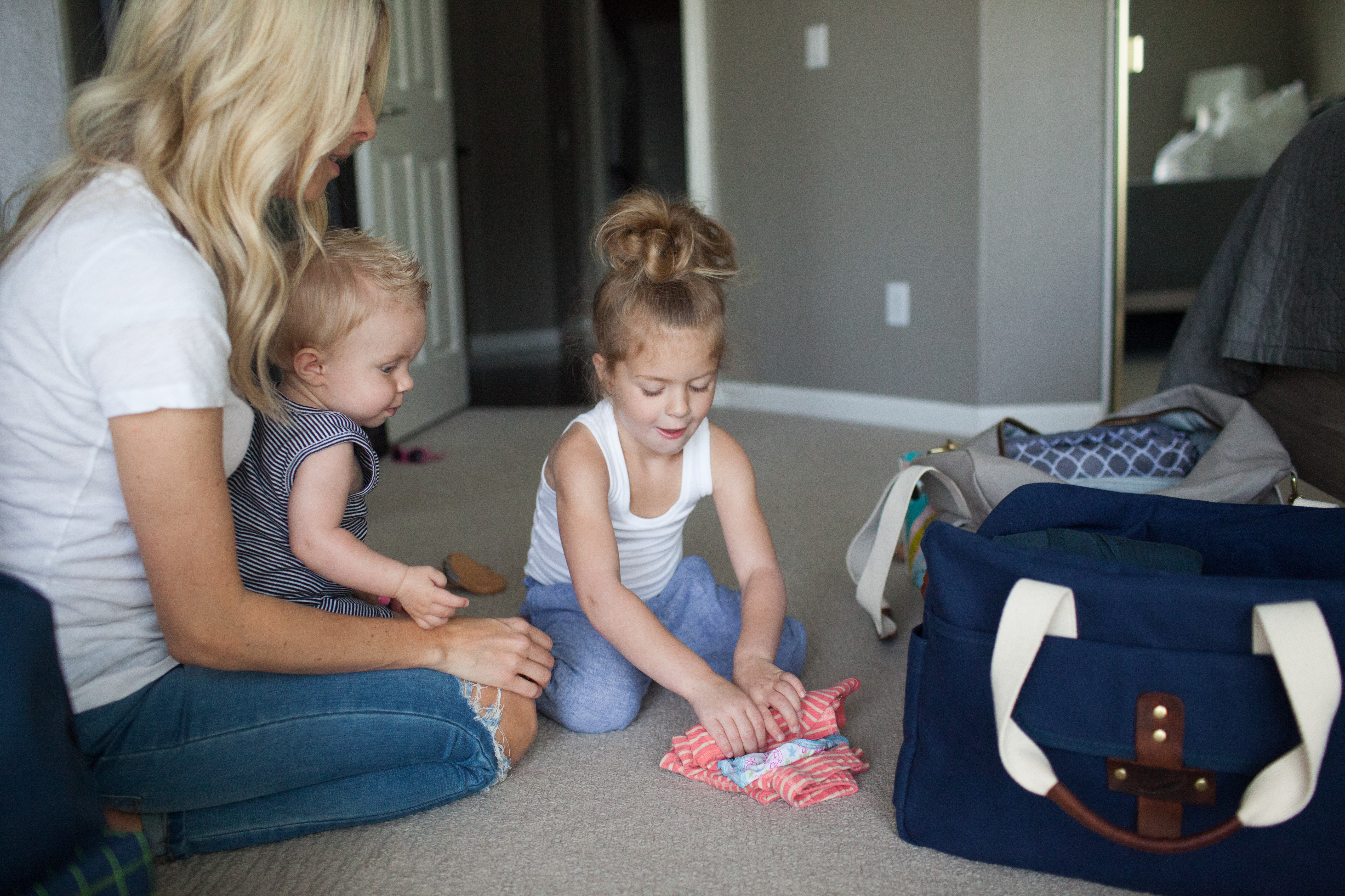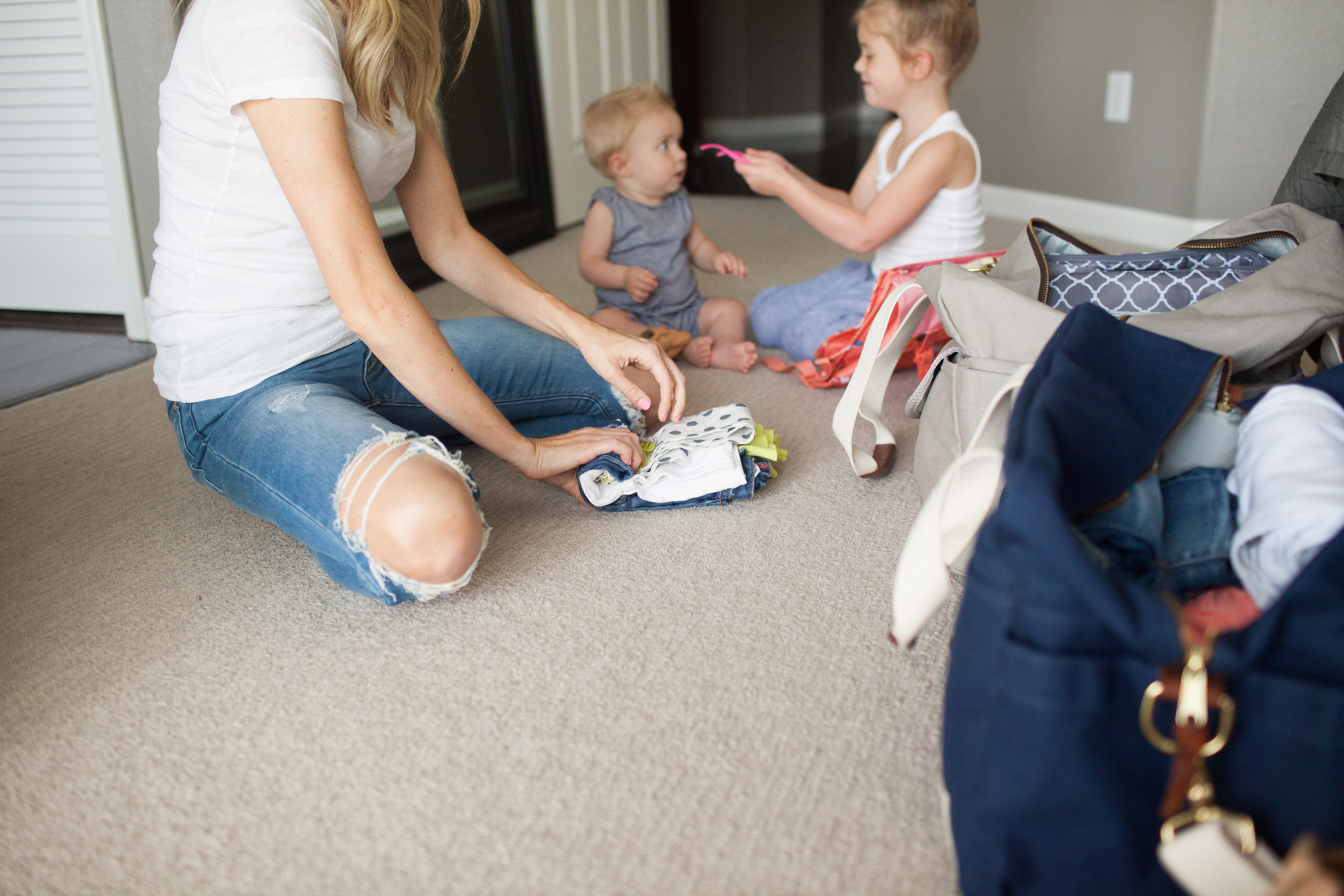 - I lay everything out in my room and make sure I haven’t over packed anyone. I also always pack one extra outfit for every single person (and a couple for the baby) because you never know whats going to happen, or who’s going to spill something on you or themselves. haha. Then I stack each outfit with everything my people will need for that day – pants, top, underwear, socks, bow etc and roll it all up together. Continue to roll each individual outfit for your whole family. This makes it so easy once your on your vacation and keeps your suitcase or bag nice the entire trip. I even roll up pajamas + underwear together to make the night time routine even easier.
