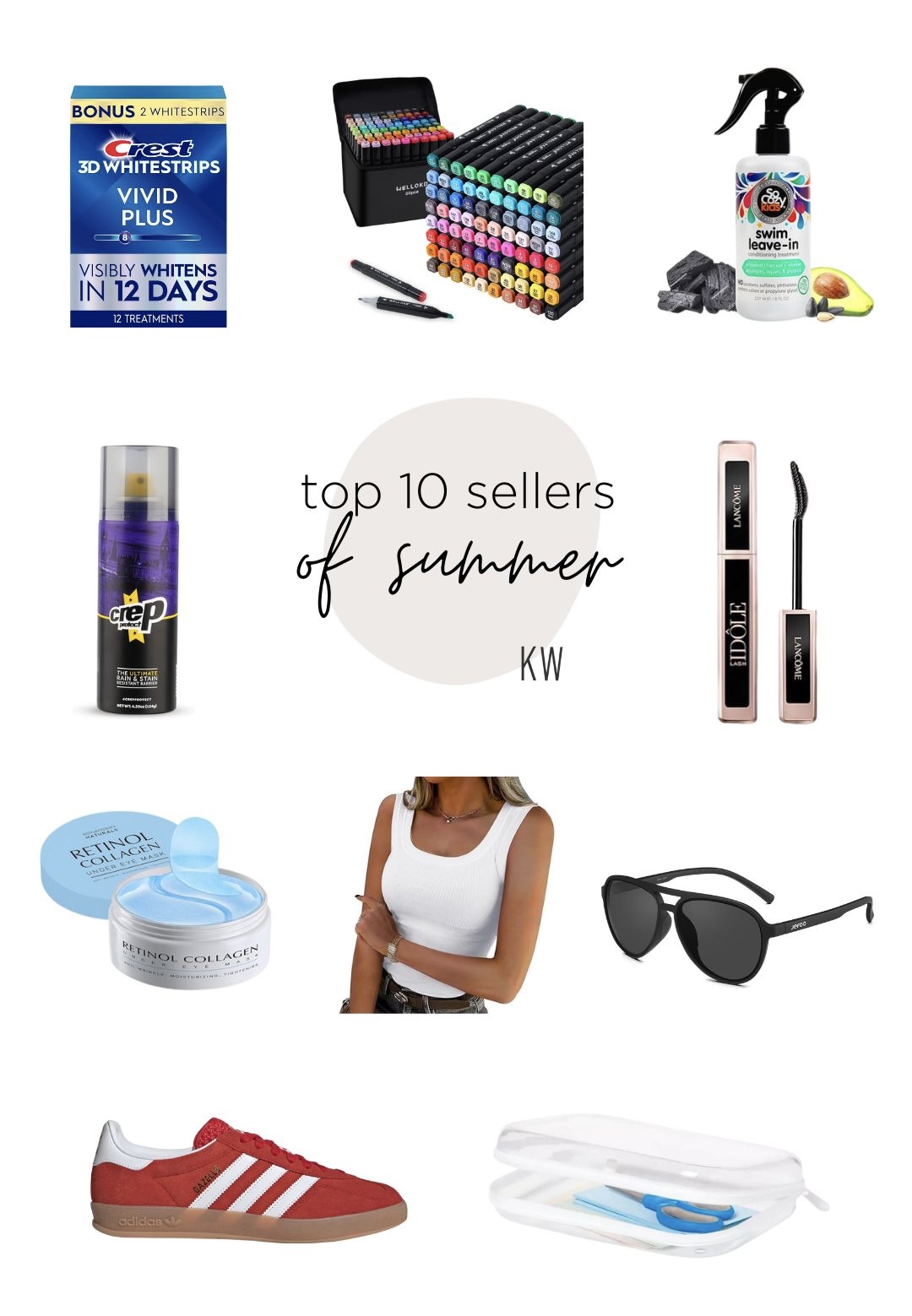 whitening strips + markers + leave-in conditioner + shoe spray + mascara + eye masks + tank top + sunglasses + adidas shoes + zipper case
