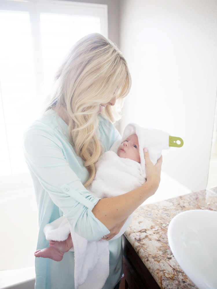 - Puj Hooded Towel : so this towel is awesome. It has a little hook that you can use to drape the towel around your neck (like a necklace) so it protects you from getting wet,but best of all you just pick baby up and place him right on your chest and wrap the towel around. No more reaching for the towel anymore.