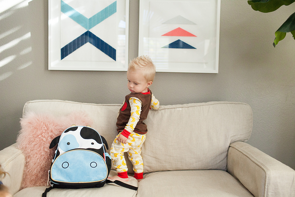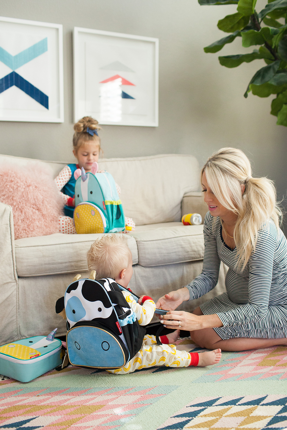 We usually leave either late at night or super early in the morning (to avoid traffic at all costs) So the little people stay in their comfy pajamas + nap/sleep on the way. This is a game changer….because Houston does NOT travel well. When we travel I let each kid pack a small backpack of things to entertain them on the ride there and some snacks. I also always have them bring a drink in a non-spillable cup so I don’t have to worry about any spills in the van.