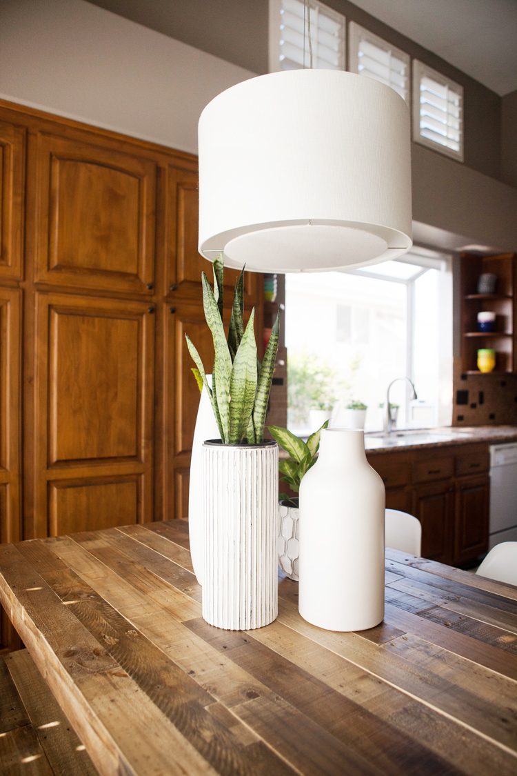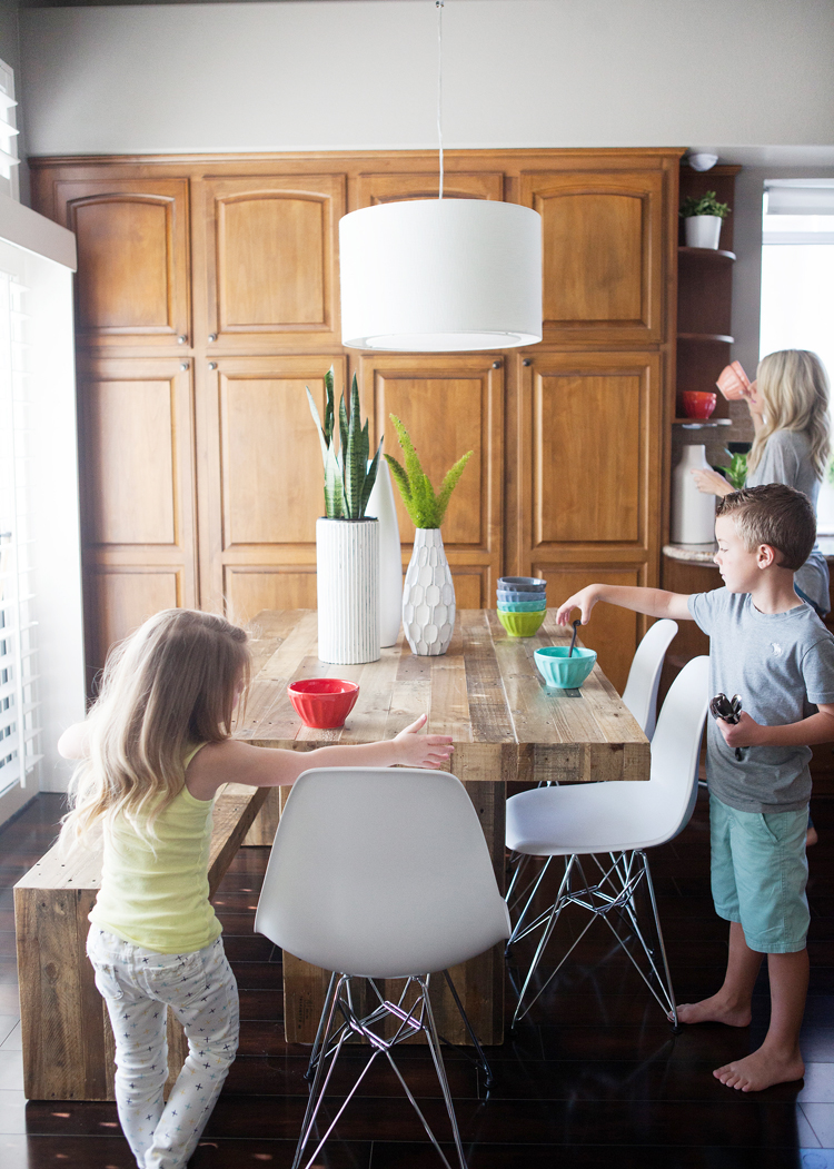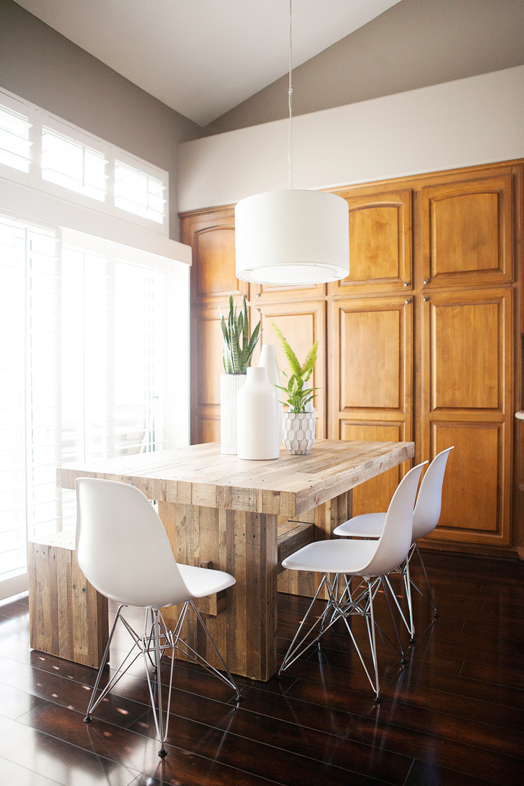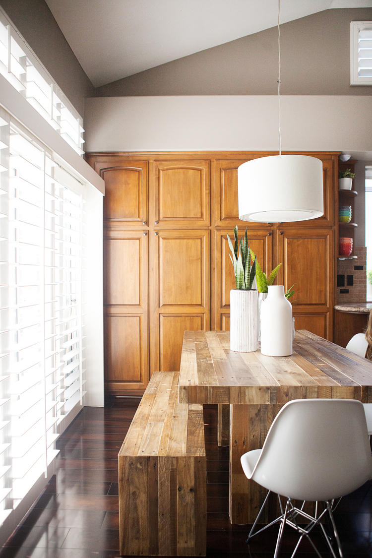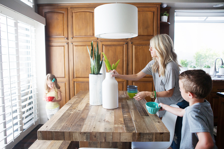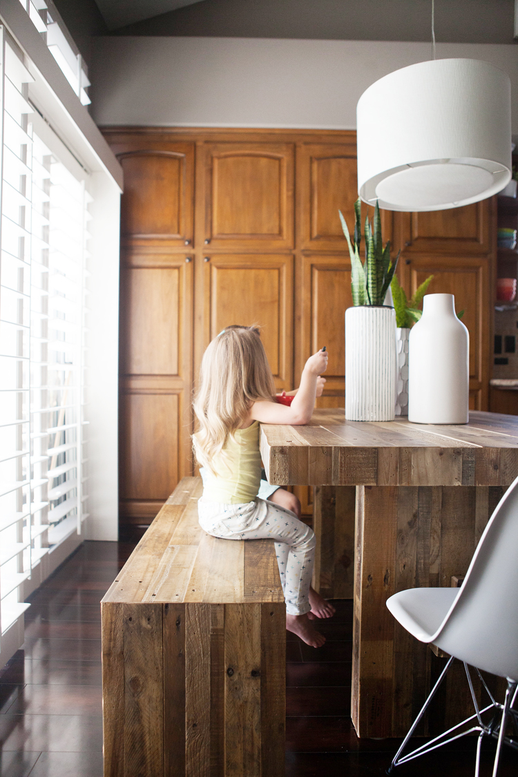 If you don’t know we live in a tiny, teeny, extra small (for six people) house in Southern California. It was quite old when we bought it, but we had it painted, replaced the wood floors + carpet and got new baseboards. Little by little we’ve updated each room over the last four years. Well, we finally got to the dining room part of the house. Since the day we moved in we wanted a new dining table, one that would seat our growing family, but with the awkward lay-out and really little space given no table fit or was big enough for all our people. Plus, I wanted something we could “live” on and I wouldn’t have to worry about the kids scratching or denting it.