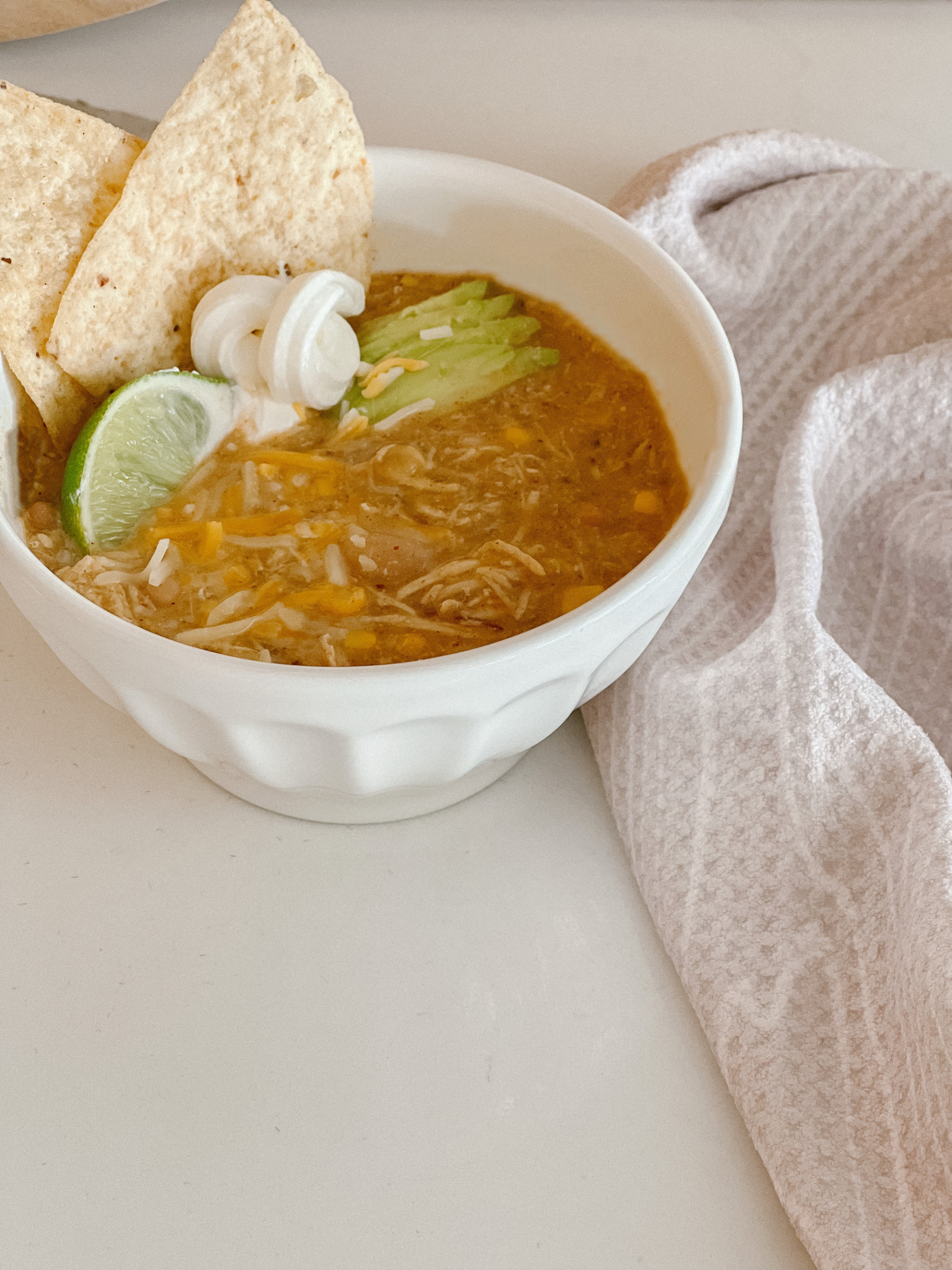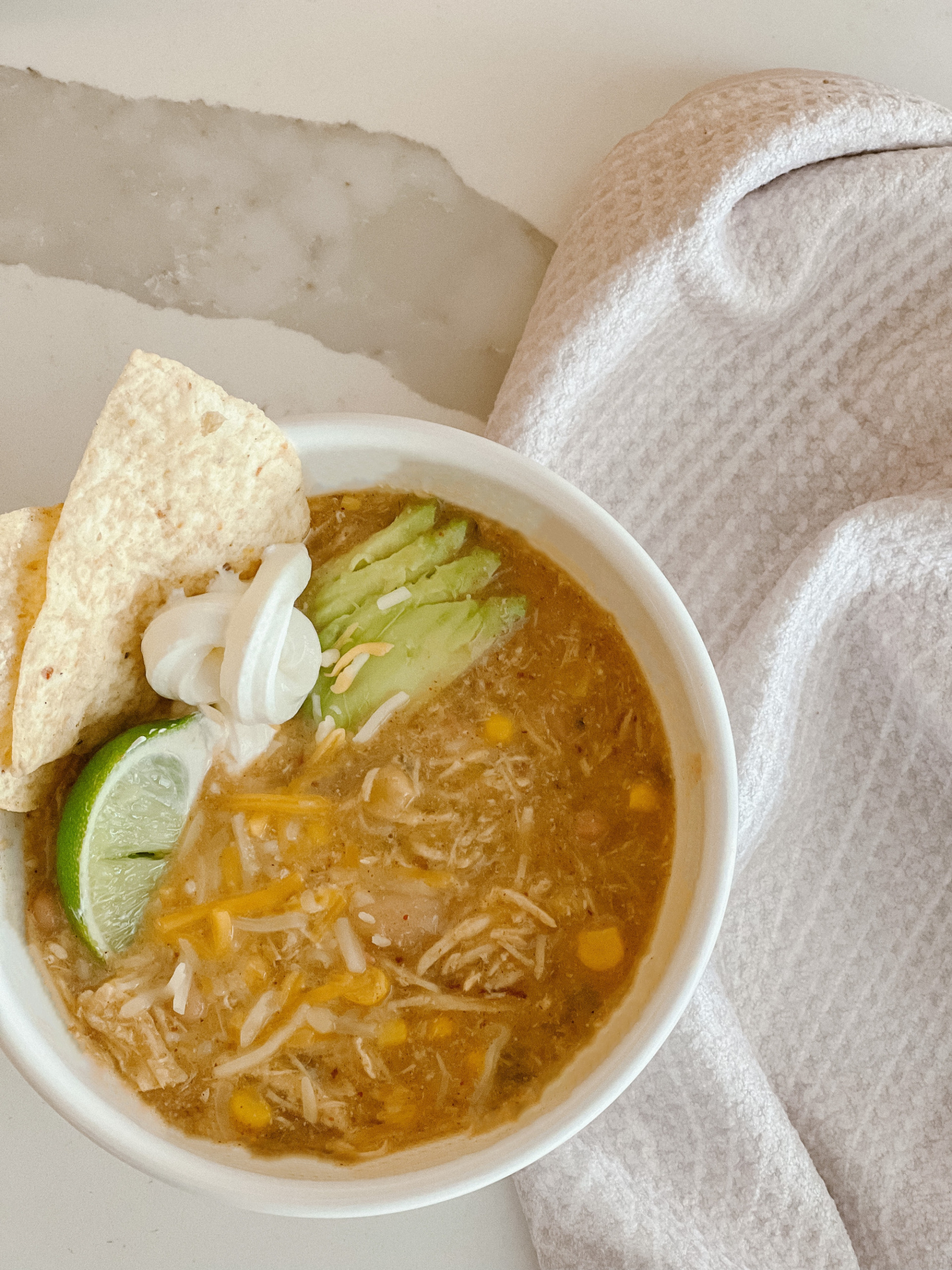 I don’t know about you, but when September comes, I just want to eat nice warm comfort food, which brings me to today’s recipe. This White Chicken Chili is one of our favorites during the fall and winter! Not only is it super delicious, but you can throw it together quickly, and it makes the best leftovers!