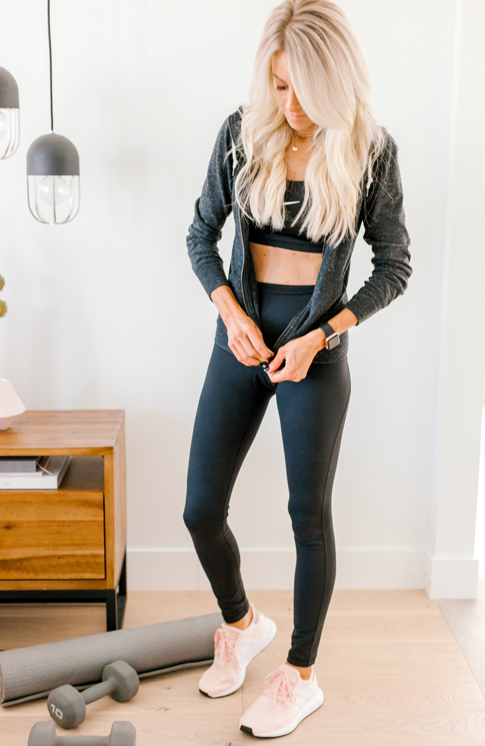jacket + similar | sports bra + similar | leggings + similar | shoes (sold out) similar + here | weights | yoga mat
